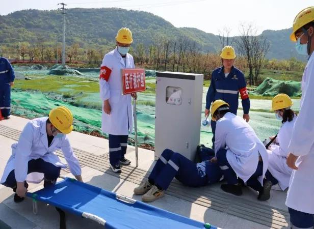本次演練主要分為事故演練和應急處置措施培訓兩部分。首先開始的事故演練以一名電工檢修配電箱時突發(fā)觸電事故為背景。項目部接到事故匯報后,立即按既定預案啟動事故應急處置程序,各應急小組迅速到位、協調配合,分別承擔現場警戒、人員應急醫(yī)護救援、后勤物資保障等任務,順利完成了本次演練。在應急處置措施培訓環(huán)節(jié),項目部邀請了溧水區(qū)永陽鎮(zhèn)社區(qū)醫(yī)院醫(yī)生現場講解、培訓了心肺復蘇、人工呼吸等施工常見事故的緊急處理措施。全部演練結束后,南京市溧水區(qū)城鄉(xiāng)建設局質量安全監(jiān)督站負責人對演練成果及項目部有序有效的組織能力表示了肯定。