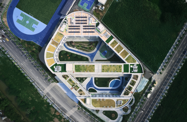 河西新城四小位于南京市建鄴區(qū)江山大街以北、黃山路以東,建筑面積2.79萬(wàn)平方米,教學(xué)樓主體4層,局部3層,地下1層,建筑高度16.95米,可容納教職工和學(xué)生1705人。建筑整體采用扁平化“曰”字形結(jié)構(gòu),包含傳道授業(yè)的教學(xué)理念,造型可演化為鉛筆、書籍、綠葉,寓意在學(xué)習(xí)中獲得知識(shí)、不斷成長(zhǎng)。