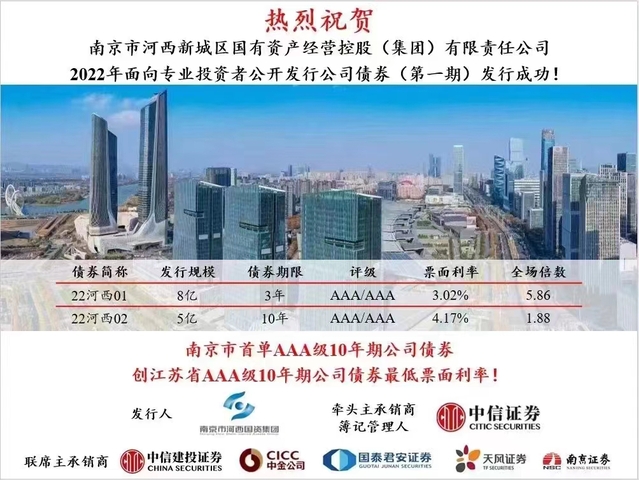 本次發(fā)行為批文下首期發(fā)行,由中信證券擔(dān)任牽頭主承銷商及簿記管理人,在主承銷商的共同努力下獲得了圓滿成功。本次發(fā)行獲得了市場投資者的高度認(rèn)可,體現(xiàn)了投資人對(duì)河西集團(tuán)未來業(yè)務(wù)發(fā)展的強(qiáng)烈信心!本次發(fā)行的10年期品種,亦為南京市首單10年期公司債券。河西集團(tuán)本次發(fā)行10年期公司債券,以較低的融資成本鎖定了長期的資金需求,充分體現(xiàn)河西集團(tuán)對(duì)市場時(shí)機(jī)的準(zhǔn)確把握以及對(duì)直融市場融資工具成熟的使用能力,為債券市場作出了積極的示范效應(yīng)。