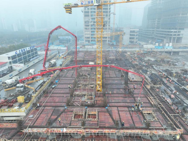 1月3日,河西金融中心項目塔樓及裙樓正負(fù)零板澆筑完成,比原計劃提前了75天。為了確保工程進(jìn)度,項目人員加班加點,節(jié)假日仍堅守崗位,運輸車、塔吊和汽車泵等各種施工機械緊張作業(yè),仿佛在進(jìn)行一場與時間賽跑的“戰(zhàn)斗”,最終保證了澆筑工作順利完成。